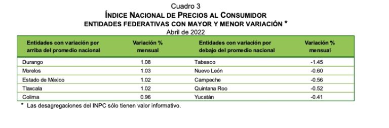 A modo de remate, Inegi resaltó que las entidades donde más se ubicó una variación del INPC durante el periodo evaluado fueron Durango (1.08%), Morelos (1.03%) y el Estado de México (1.02%), mientras que las entidades con una variación más baja fueron Tabasco (-1.45%), Nuevo León (-0.60%) y Campeche (-0.56).