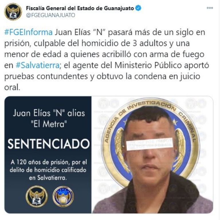 Juan Elías ‘N’ de pasará más de un siglo en prisión, culpable del homicidio de 3 adultos y una menor de edad a quienes acribilló con arma de fuego en Salvatierra; el agente del Ministerio Público aportó pruebas contundentes y obtuvo la condena en juicio oral”, se lee en el mansaje de Twitter.