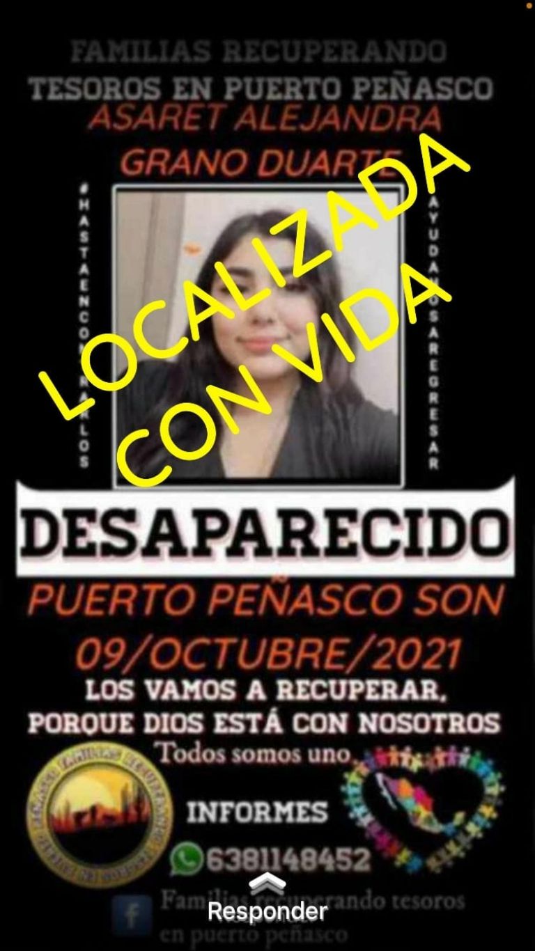 Puerto Peñasco, Sonora.- Luego de varios días llenos de incertidumbre y preocupación, una familia de Puerto Peñasco pudo estar tranquila de nuevo con el hallazgo de la joven Asaret Alejandra Grano Duarte, quien permanecía en calidad de desaparecida.