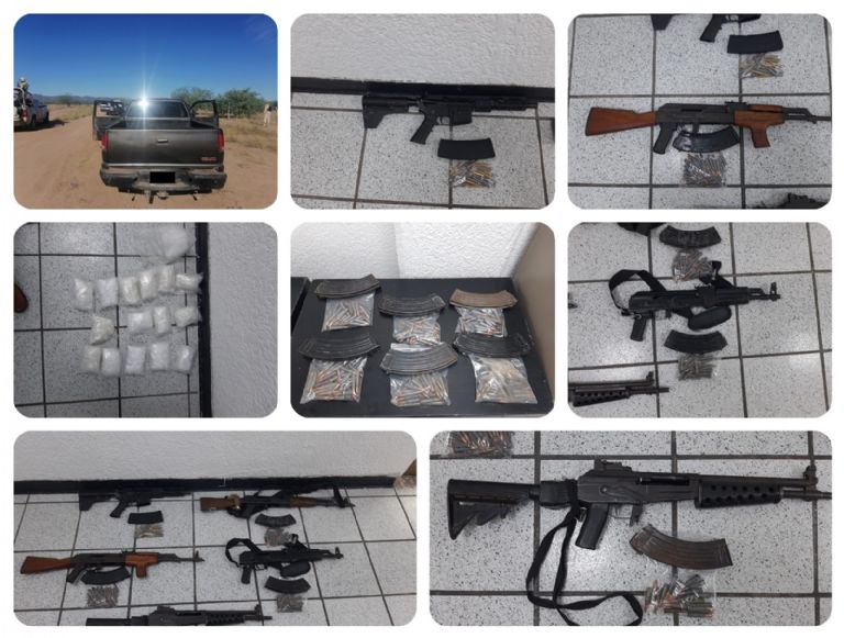 A los imputados les aseguraron cuatro armas de fuego tipo fusil calibre 7.62x39 milímetros abastecidos con 106 cartuchos en conjunto, un arma de fuego tipo fusil calibre .223 milímetros, abastecido con 26 cartuchos, seis cargadores abastecidos con 180 cartuchos calibre 7.62x39 en conjunto, 100 gramos de marihuana y 100 gramos de metanfetamina.