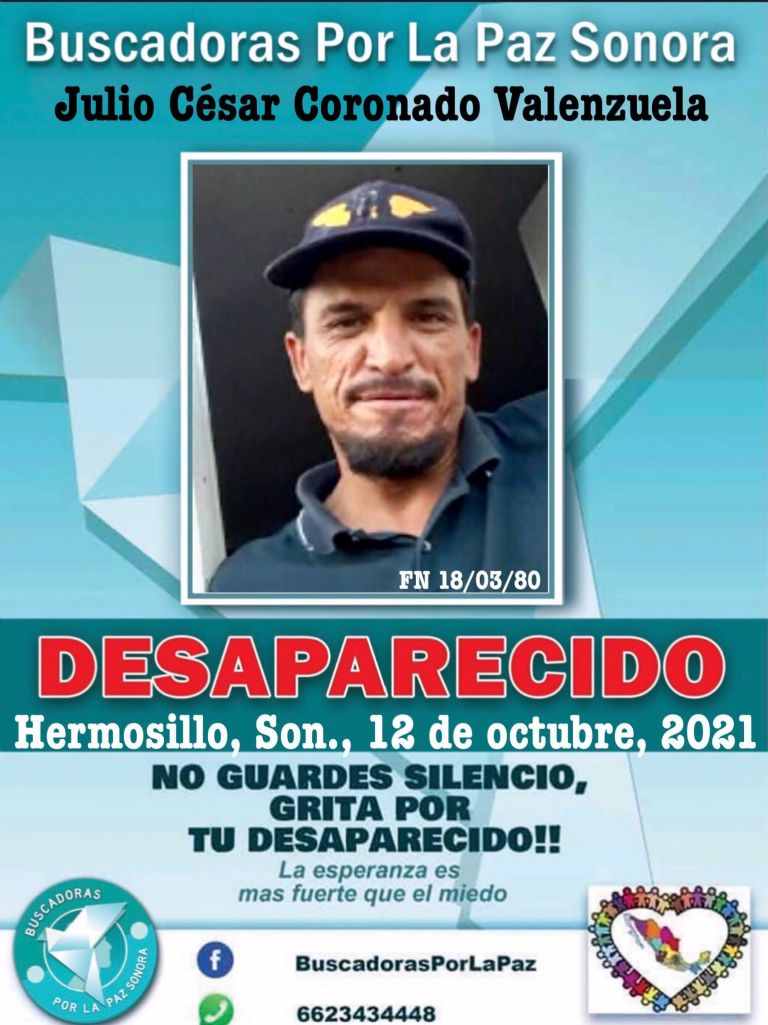 Ciudad Obregón, Sonora.- Desde hace poco más de una semana que nada se sabe sobre el paradero de Julio César Coronado Valenzuela, hombre originario de Hermosillo que se encuentra en calidad de desaparecido y es buscado por su familia.