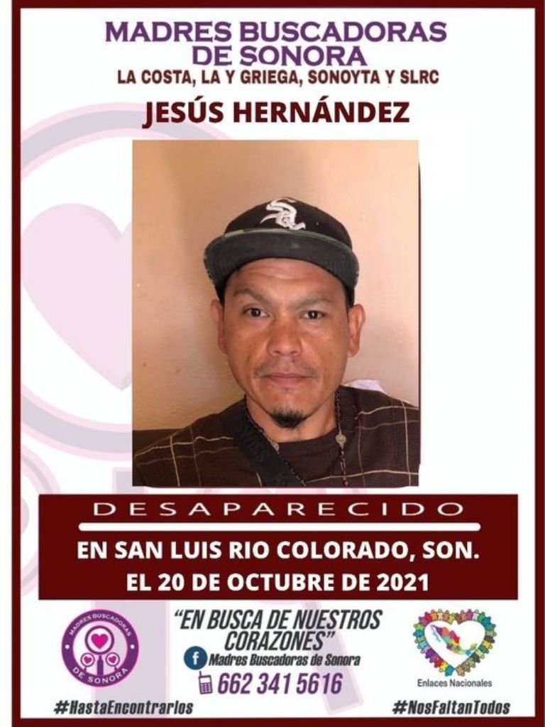 Hermosillo, Sonora.- Este fin de semana, el colectivo Madres Buscadoras de Sonora solicitó la ayuda de la comunidad para localizar a Jesús Hernández, hombre que desapareció hace varios días en su natal San Luis Río Colorado, Sonora.
