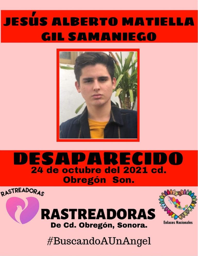 Ciudad Obregón, Sonora.- Una angustiada madre busca la ayuda de la comunidad para encontrar a su hijo Jesús Alberto Matiella Gil Samaniego, joven estudiante universitario que desapareció en Ciudad Obregón, Sonora.