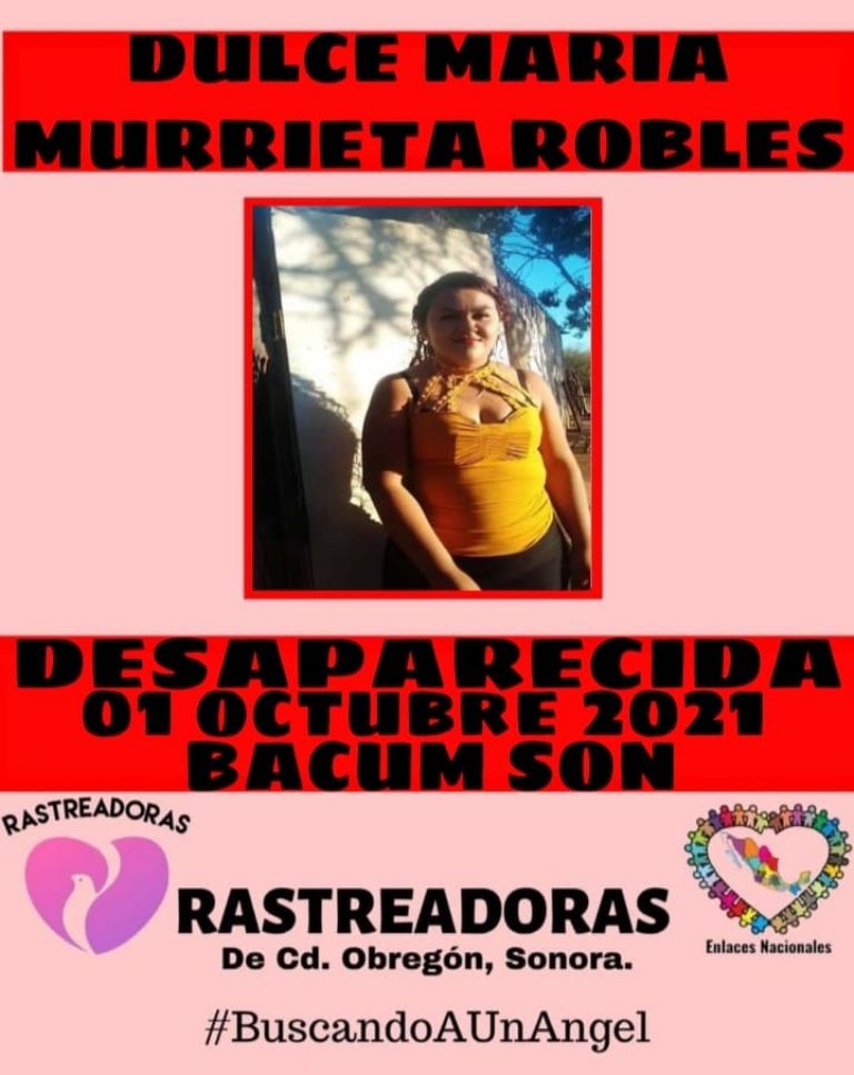 Bácum, Sonora.- Este fin de semana, el colectivo Rastreadoras de Ciudad Obregón reportó la lamentable desaparición de Dulce María Murrieta Robles en el municipio de Bácum, Sonora, quien es buscado sin descanso por sus familiares.