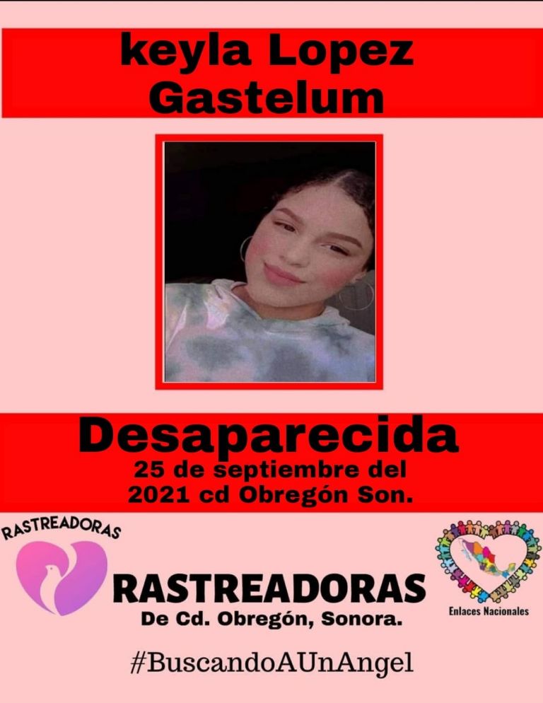 Ciudad Obregón, Sonora.- Este fin de semana, el colectivo Rastreadoras de Ciudad Obregón informó que la joven Keyla Rosa Amelia López Gastelum fue reportada como desaparecida por su familia en Ciudad Obregón, Sonora.