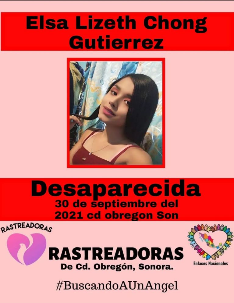 Ciudad Obregón, Sonora.- Este sábado 2 de octubre, el colectivo Rastreadoras de Ciudad Obregón confirmó que la Elisa Lizeth Chong Gutiérrez fue localizada con vida luego de haber sido reportada como desaparecida por su familia en Ciudad Obregón, Sonora.