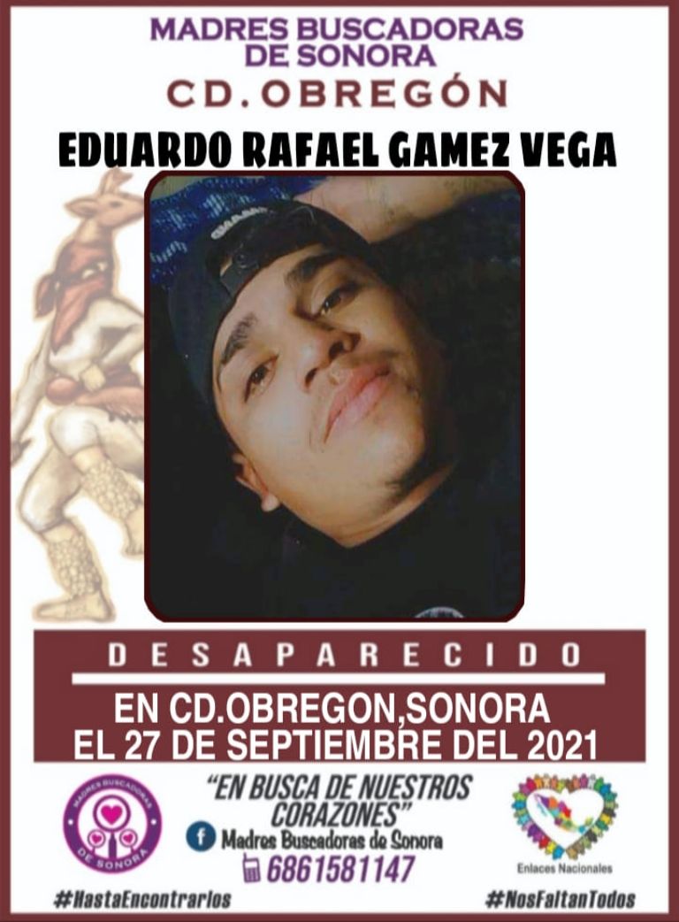 Ciudad Obregón, Sonora.- El colectivo Madres Buscadoras de Sonora reportó que el joven Eduardo Rafael Gámez Vega se encuentra desaparecido en Ciudad Obregón, Sonora desde hace poco más de una semana.