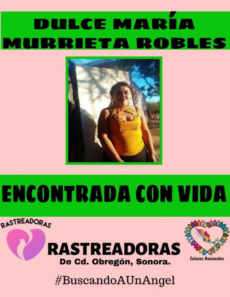 Bácum, Sonora.- La tarde de este lunes, el colectivo Rastreadoras de Ciudad Obregón reveló que la señora Dulce María Murrieta Robles fue encontrada con vida luego de su repentina desaparición en Bácum, Sonora.