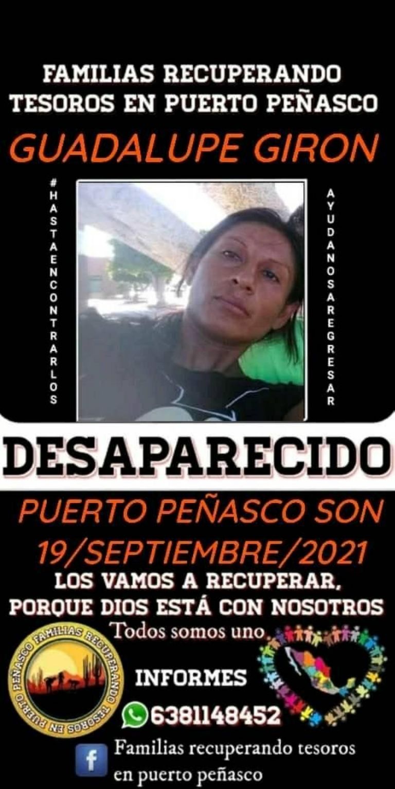 Puerto Peñasco, Sonora.- Desde hace varias semanas que nada sabe sobre el paradero de Guadalupe Girón, mujer que desapareció sin dejar rastro en Puerto Peñasco, Sonora y actualmente es buscada sin descanso por su familia.