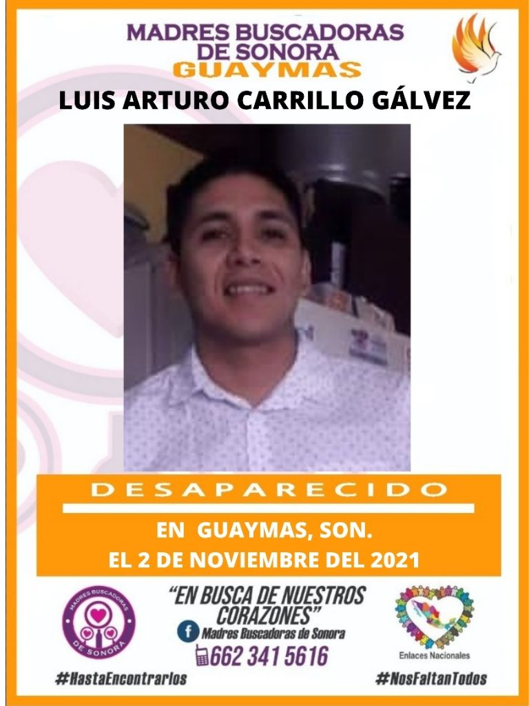 Guaymas, Sonora.- El colectivo Madres Buscadoras de Sonora solicita la ayuda de la comunidad para dar con el paradero de Luis Arturo Carrillo Gálvez, joven que se encuentra en calidad de desaparecida en Guaymas, Sonora.