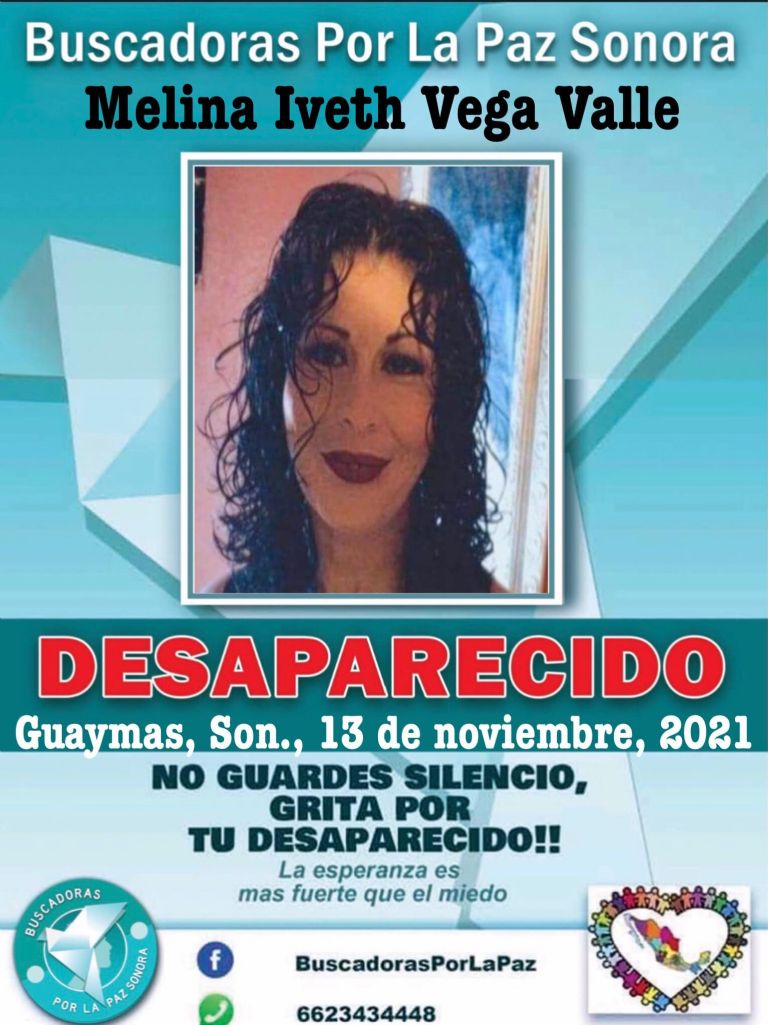 Guaymas, Sonora.- El colectivo Buscadoras por la Paz reportó la desaparición de la señora Melina Iveth Vega Valle en Guaymas, Sonora, quien es buscada por su familia, misma que pide ayuda para encontrarla sana y salva.