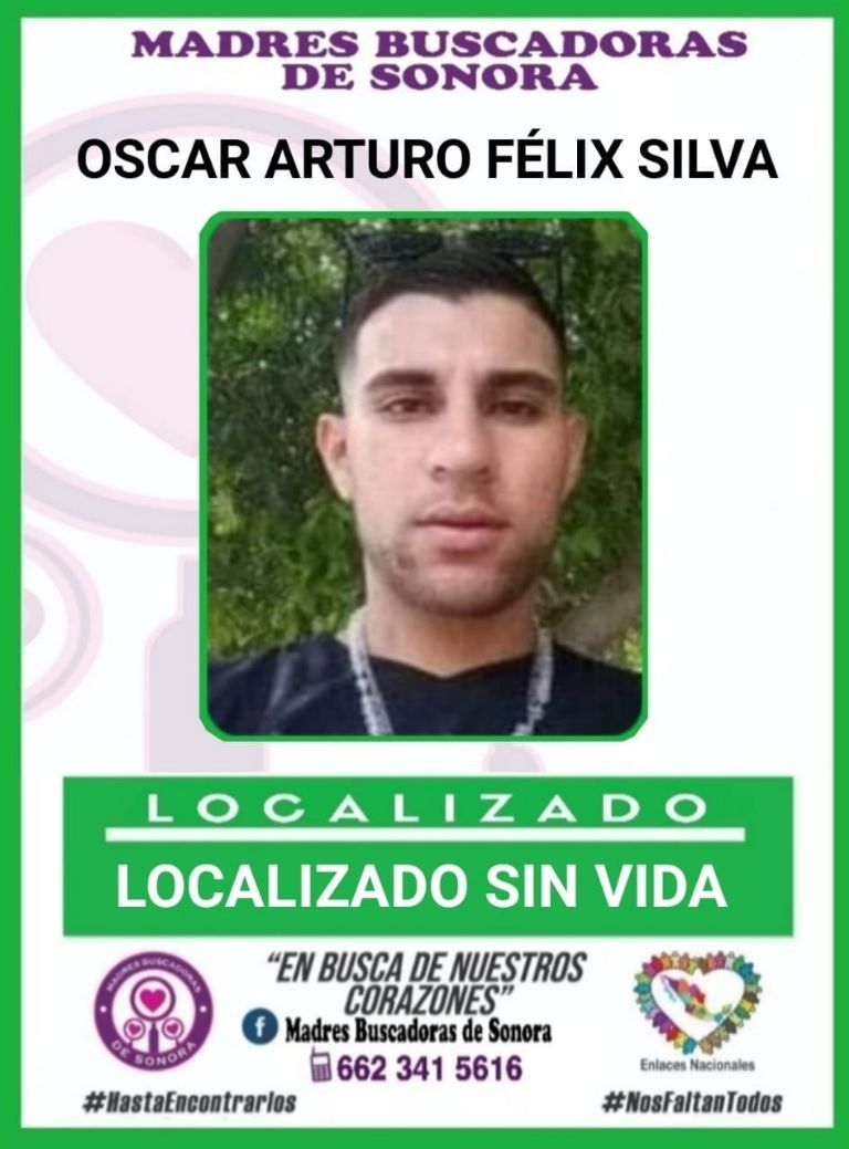 Cabe recordar que el pasado 31 de agosto, el colectivo Madres Buscadoras de Sonora confirmó que el joven Óscar Arturo Félix Silva fue localizado sin vida, luego de más de un año y medio en los que sus parientes no supieron nada de él.