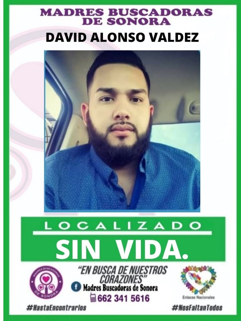 Hermosillo, Sonora.- El colectivo Madres Buscadoras de Sonora informó este fin de semana que el cuerpo sin vida de David Alonso Valdez fue localizado luego de que su familia reportara su desaparición en Nogales, Sonora.