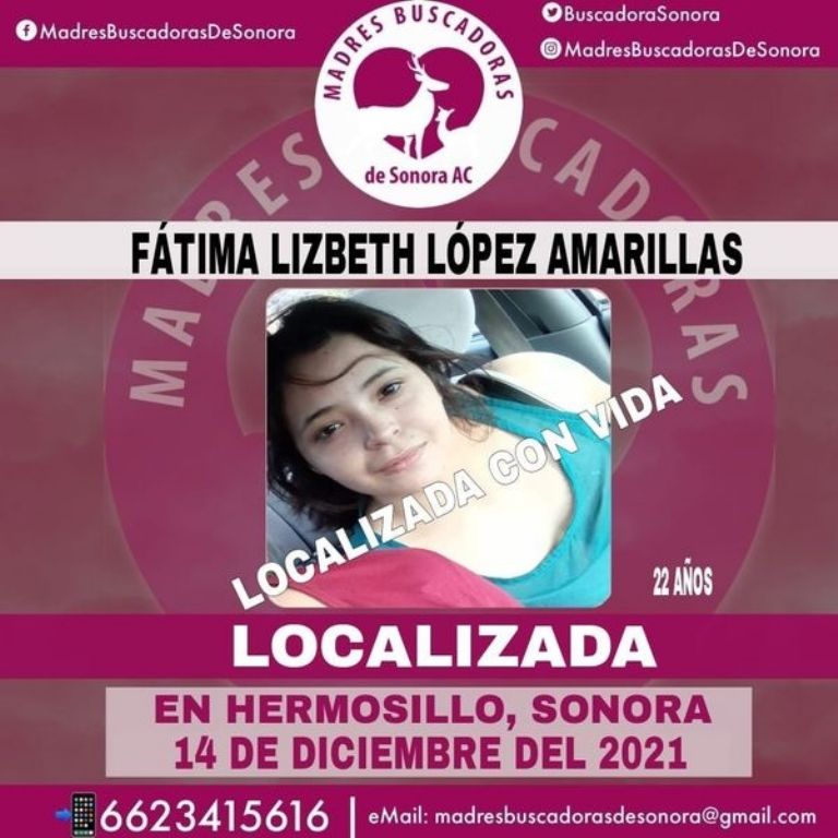 Hermosillo, Sonora.- El colectivo Madres Buscadoras de Sonora informó que la joven Fátima Lizbeth López Amarillas fue localizada con vida luego de permanecer varios horas en calidad de desaparecida en Hermosillo, Sonora.