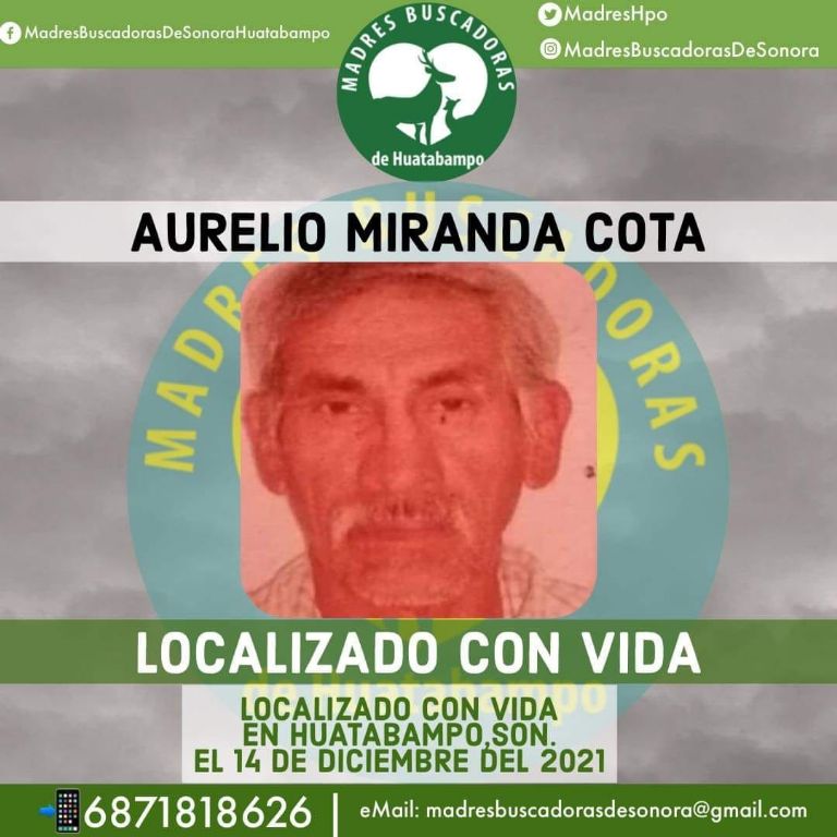 Huatabampo, Sonora.- El señor Aurelio Miranda Cota, de quien nada se sabía desde hace más de 4 meses, fue localizado con vida, así lo informó el colectivo Madres Buscadoras de Sonora esta noche de jueves.