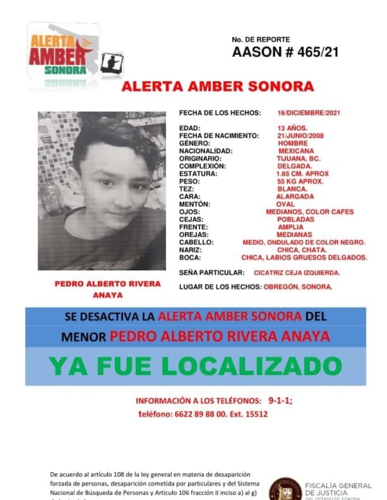 Ciudad Obregón, Sonora.- Este fin de semana se desactivó la Alerta Amber para encontrar a Pedro Alberto Rivera Anaya, joven de 13 años de edad que había desaparecido desde hace varios días en Ciudad Obregón, Sonora.