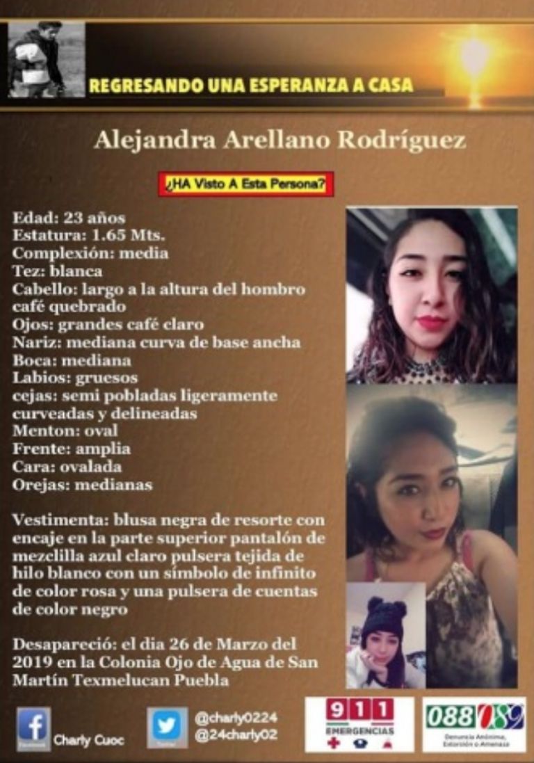 Texmelucan, Puebla.- Alejandra Arellano Rodríguez desapareció en marzo del 2019 y su paradero sigue siendo un misterio. La joven de 23 años salió al cine con un amigo y él apareció decapitado.