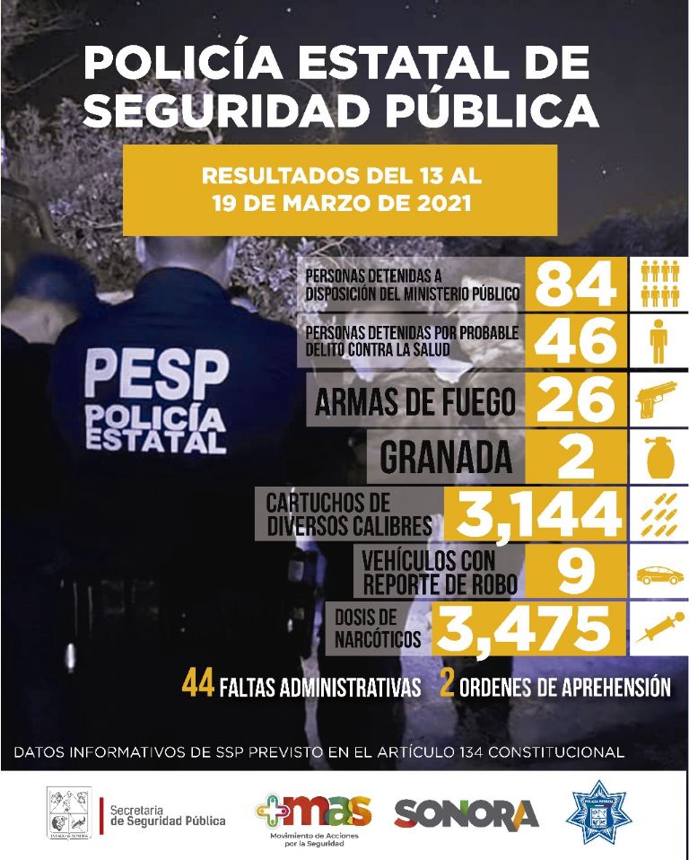 Hermosillo, Sonora.- La Policía Estatal de Seguridad Pública (PESP) informó que durante esta semana recuperó nueve autos robados y aseguró a 84 personas por posibles delitos y dos más por orden de aprehensión, además incautaron armas, cartuchos y drogas.