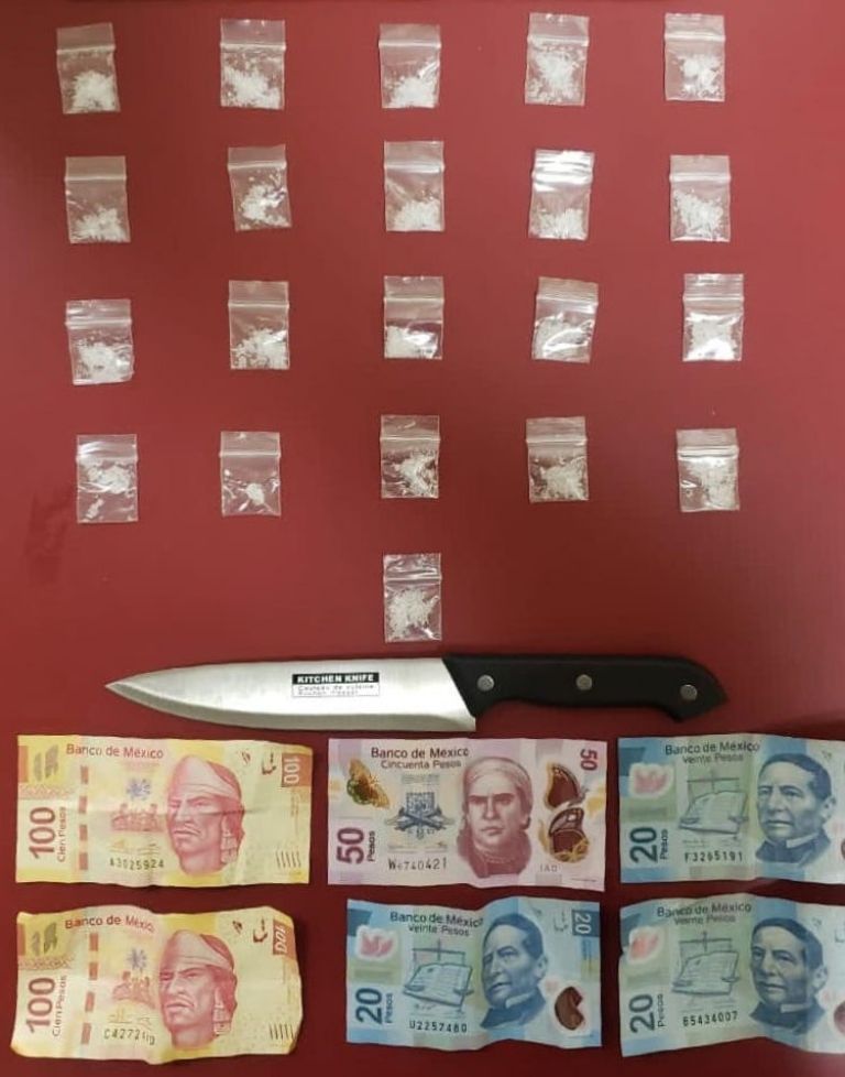 El domingo 20 de marzo en la colonia Sonora, la Policía Estatal aseguró en la colonia Sonora a Gabriel 'N', de 52 años de edad, por posesión de arma blanca y cinco envoltorios de sustancia granulada.