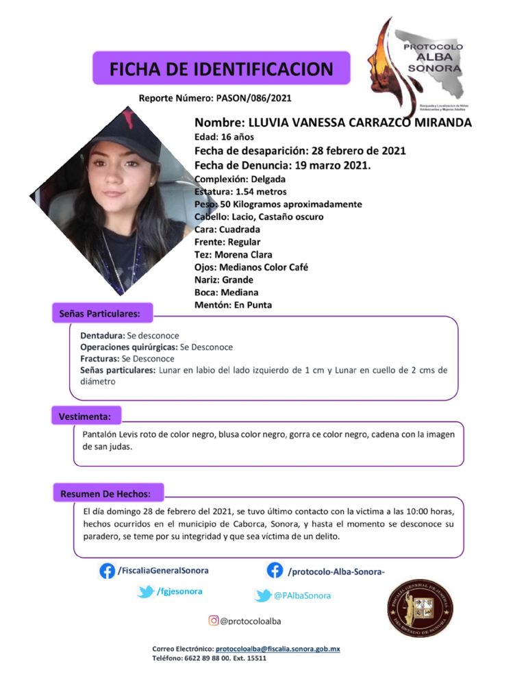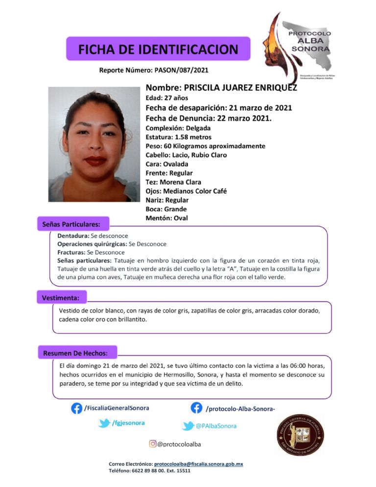 A través de redes sociales, la cuenta oficial del Protocolo Alba publicó las fichas de las dos féminas identificadas como Priscila Juárez Enríquez de 27 años, desaparecida en Hermosillo y Lluvia Vanessa Carrazco Miranda de 16 años, extraviada en Caborca.
