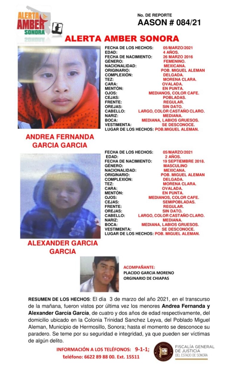 En el boletín se informó que se trata de los menores Andrea Fernanda y Alexander García García y ambos son originarios del poblado Miguel Alemán en el municipio de Hermosillo.