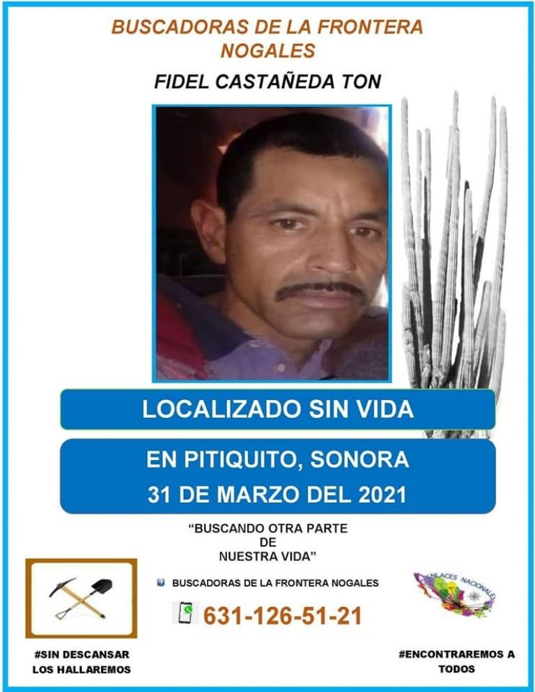 Pitiquito, Sonora.- Este jueves, el colectivo Buscadoras de la Frontera Nogales confirmó el hallazgo del cuerpo sin vida de Fidel Castañeda Ton, hombre reportado como desaparecido desde el pasado 29 de marzo.