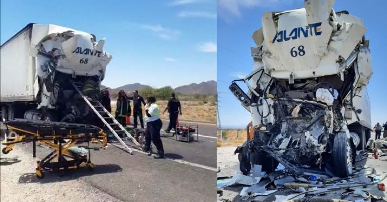 El fuerte percance se registró alrededor de las 12:00 horas de este martes, a la altura del kilómetro 22, hasta donde se trasladó personal de Bomberos de Hermosillo, quien labores labores de rescate de uno de los choferes, el cual quedó prensado en la unidad.
