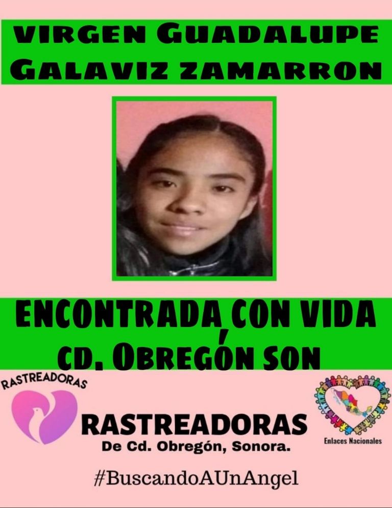 Se trata de Virgen Guadalupe Galaviz Zamarrón, de 15 años de edad, quien fue encontrada sana y salva este lunes tras 2 días en lo que su familia no supo de su paradero. Por el momento se desconoce dónde fue hallada o bajo qué circunstancias.