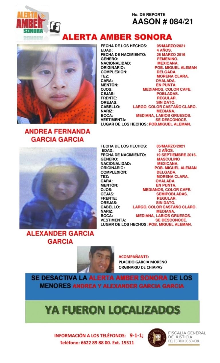 Hermosillo, Sonora.- Las dos niños Andrea Fernanda y Alexander García García, de 4 y 2 años de edad respectivamente, que fueron reportados como desaparecidos en el poblado Miguel Alemán, municipio de Hermosillo, fueron localizados con bien.