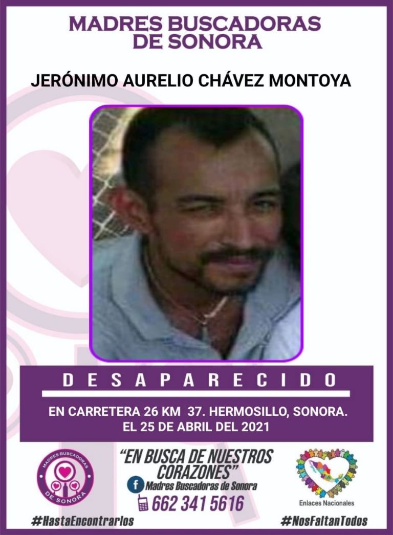 Hermosillo, Sonora.- El grupo de mujeres, Madres Buscadoras de Sonora, infirmó sobre la recientes desaparición de Jerónimo Aurelio Chávez Montoya, con quien se perdió toda comunicación cuando viajaba en una carretera de Sonora.
