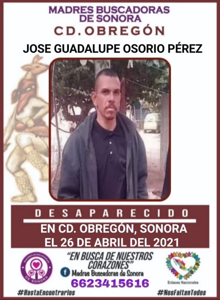 Ciudad Obregón, Sonora.- El colectivo Madres Buscadoras de Sonora informó recientemente sobre la desafortunada desaparición de José Guadalupe Osorio Pérez, de quien no se sabe nada desde hace varios días.