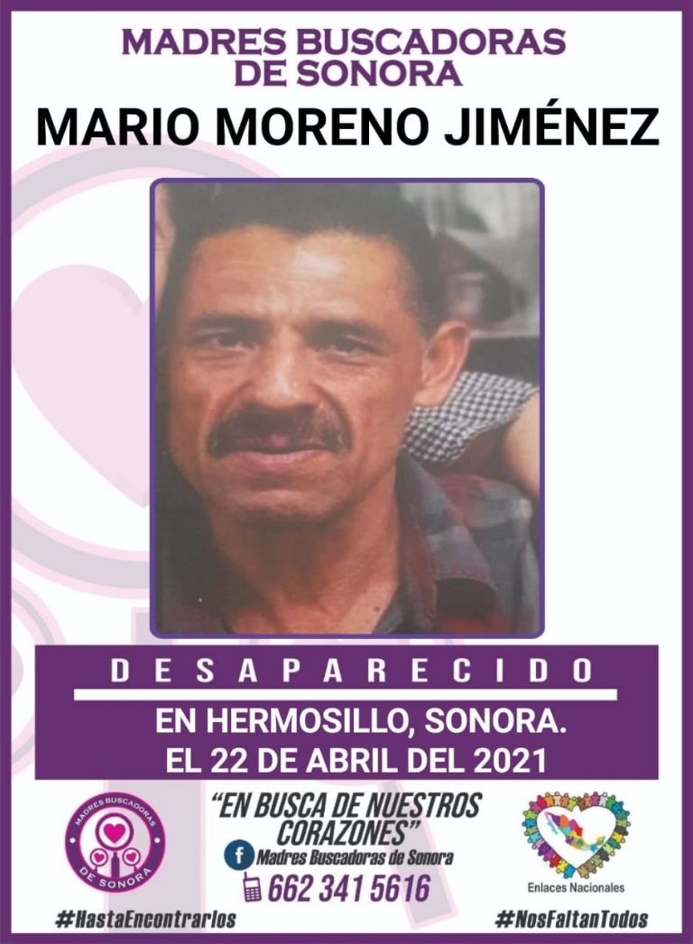 Hermosillo, Sonora.- El colectivo Madres Buscadoras de Sonora informó el pasado domingo sobre la desaparición de Mario Moreno Jiménez, hombre originario de Hermosillo, de quien nada se sabe desde hace varios semanas.