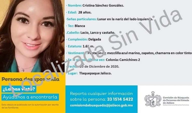 Tras la fuerte movilización de grupos de búsqueda, la Comisión de Búsqueda de Jalisco, compartió una imagen de Cristina, en la que se informó que fue localizada sin vida.