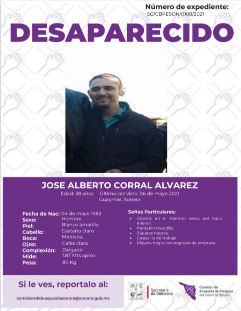 Se trata de José Alberto Corral Álvarez, de 38 años de edad, quien fue visto por última vez el 6 de mayo de 2021, 2 días después de su cumpleaños; salió de su vivienda rumbo a su trabajo, sin embargo, ya no regresó,