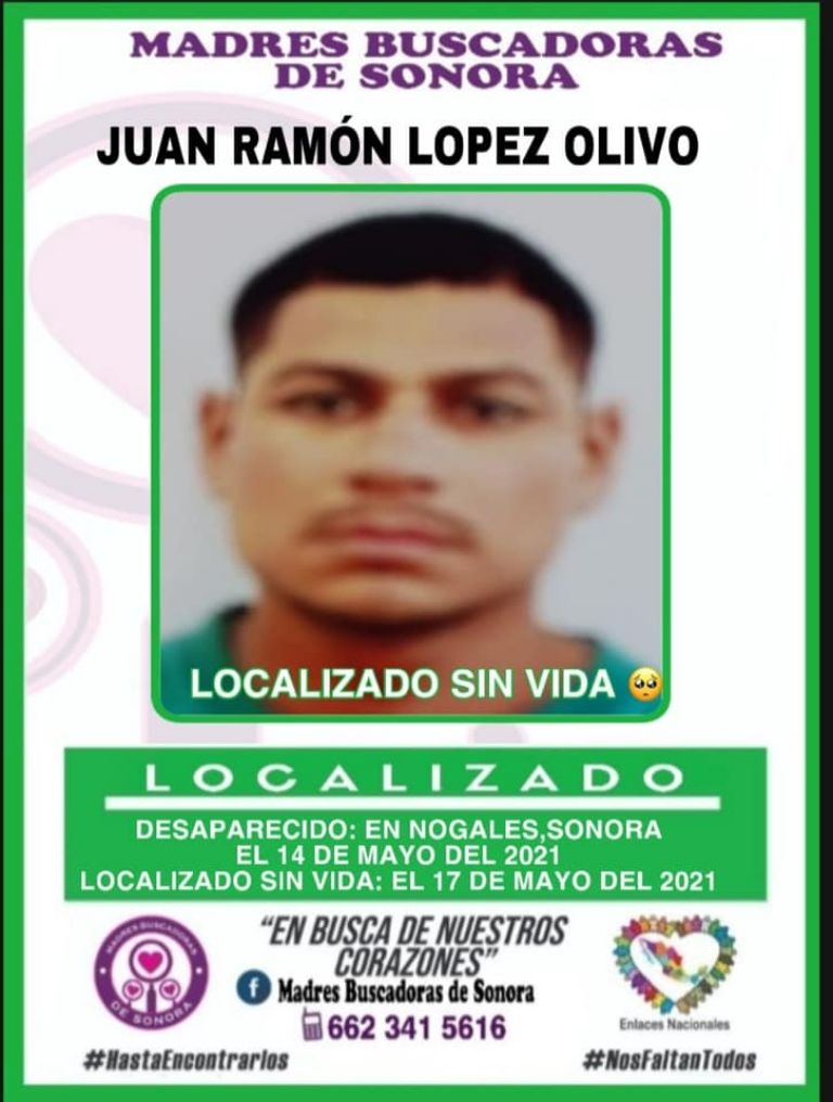 Nogales, Sonora.- La tarde del pasado lunes 17 de mayo se confirmó que Juan Ramón López Olivo fue encontrado sin vida, después de permanecer varios días en calidad de desaparecido en su natal Nogales, Sonora.