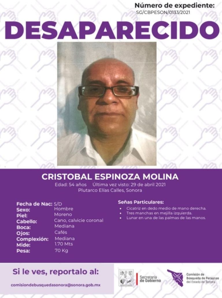 Sonoyta, Sonora.- La tarde de ayer 21 de mayo se informó sobre la lamentable desaparición del señor Cristóbal Espinoza Molina, residente del municipio Plutarco Elías Calles, de quién no se sabe nada desde hace varios días.