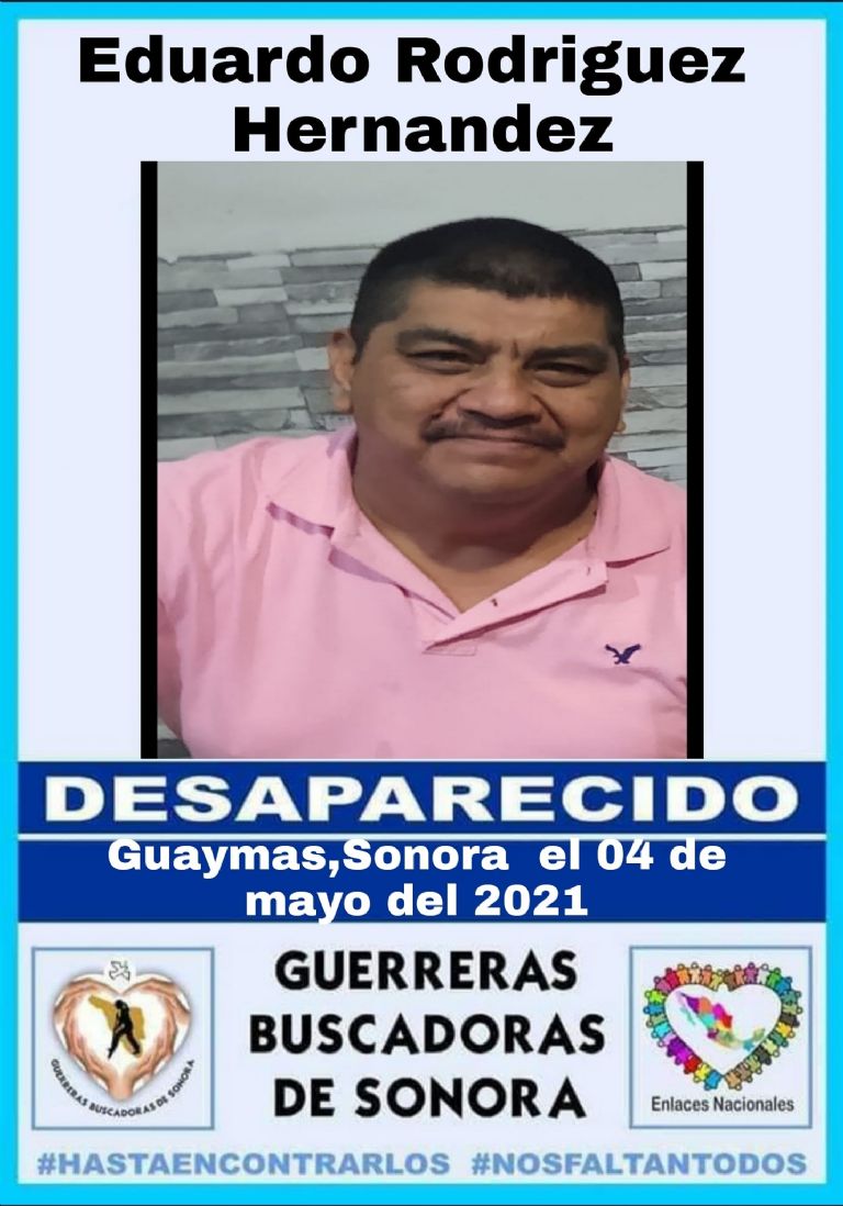 Guaymas, Sonora.- El colectivo Guerreras Buscadoras de Sonora reveló este lunes 24 de mayo que el guaymense Eduardo Rodríguez Hernández, se encuentra en calidad de desaparecido desde hace varias semanas.