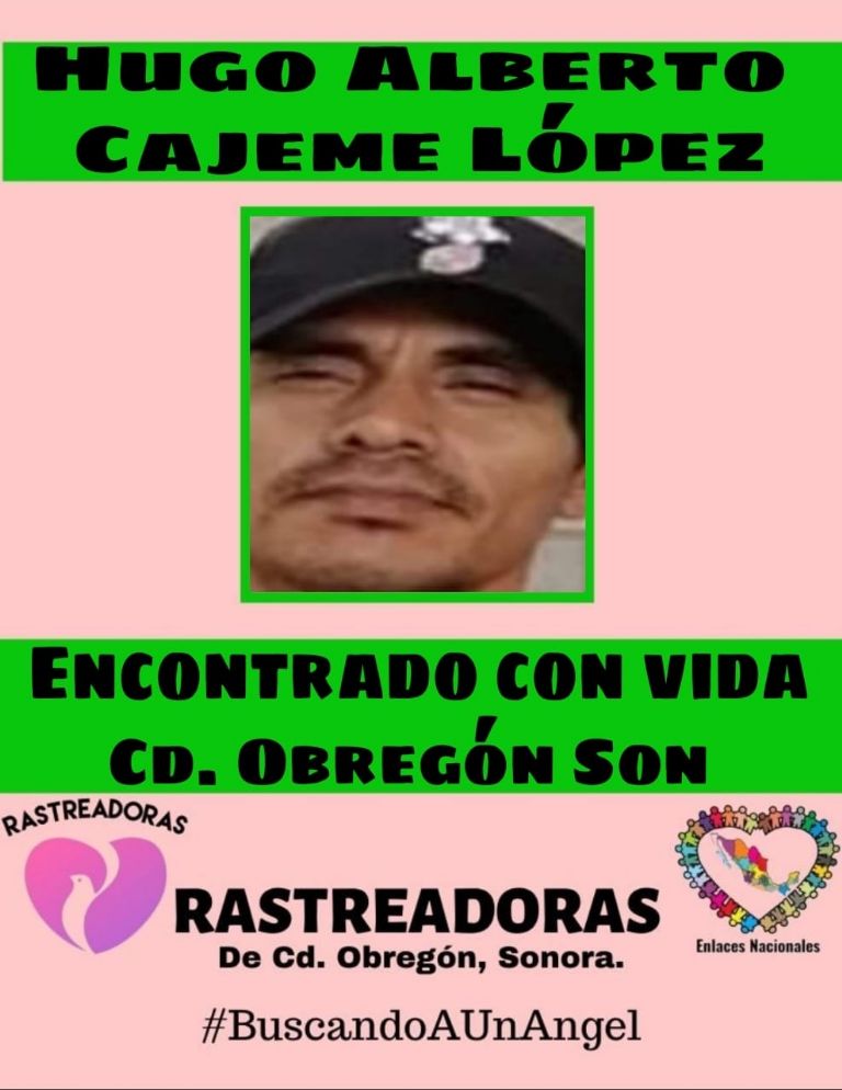 Ciudad Obregón, Sonora.- El colectivo Rastreadoras de Ciudad Obregón informó este martes 25 de mayo que Hugo Alberto Cajeme López fue encontrado con vida luego de que fuera reportado como desaparecido en Ciudad Obregón.