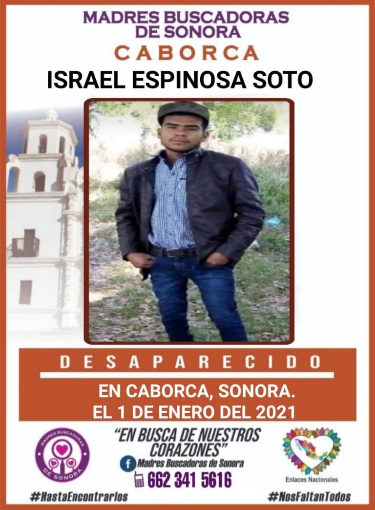 Caborca, Sonora.- El colectivo Madres Buscadoras de Sonora reveló este jueves 27 de mayo que el joven Israel Espinosa Soto, residente de Caborca, se encuentra en calidad de desaparecido desde hace varios meses.