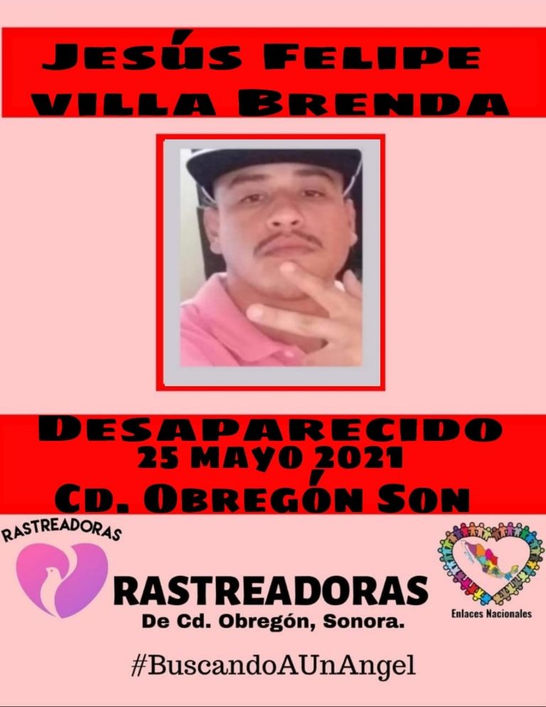 Ciudad Obregón, Sonora.- El colectivo Rastreadoras de Ciudad Obregón reveló este sábado 29 de mayo que el joven Jesús Felipe Villa Brenda se encuentra en calidad de desaparecido desde hace varios días en Ciudad Obregón.