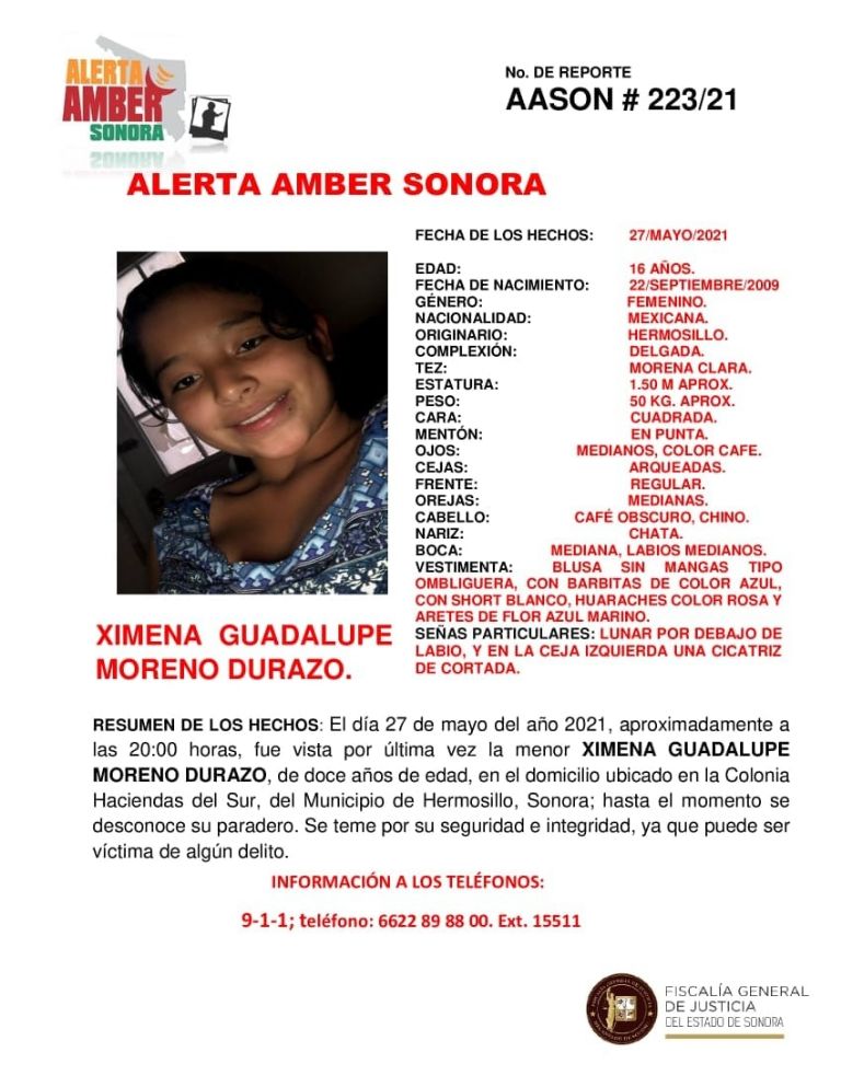 Hermosillo, Sonora.- La noche de este sábado se activó la Alerta Amber en Sonora por la desaparición de la menor de edad Ximena Guadalupe Moreno Durazo, quien fue vista por última vez el pasado 27 de mayo en su natal Hermosillo.