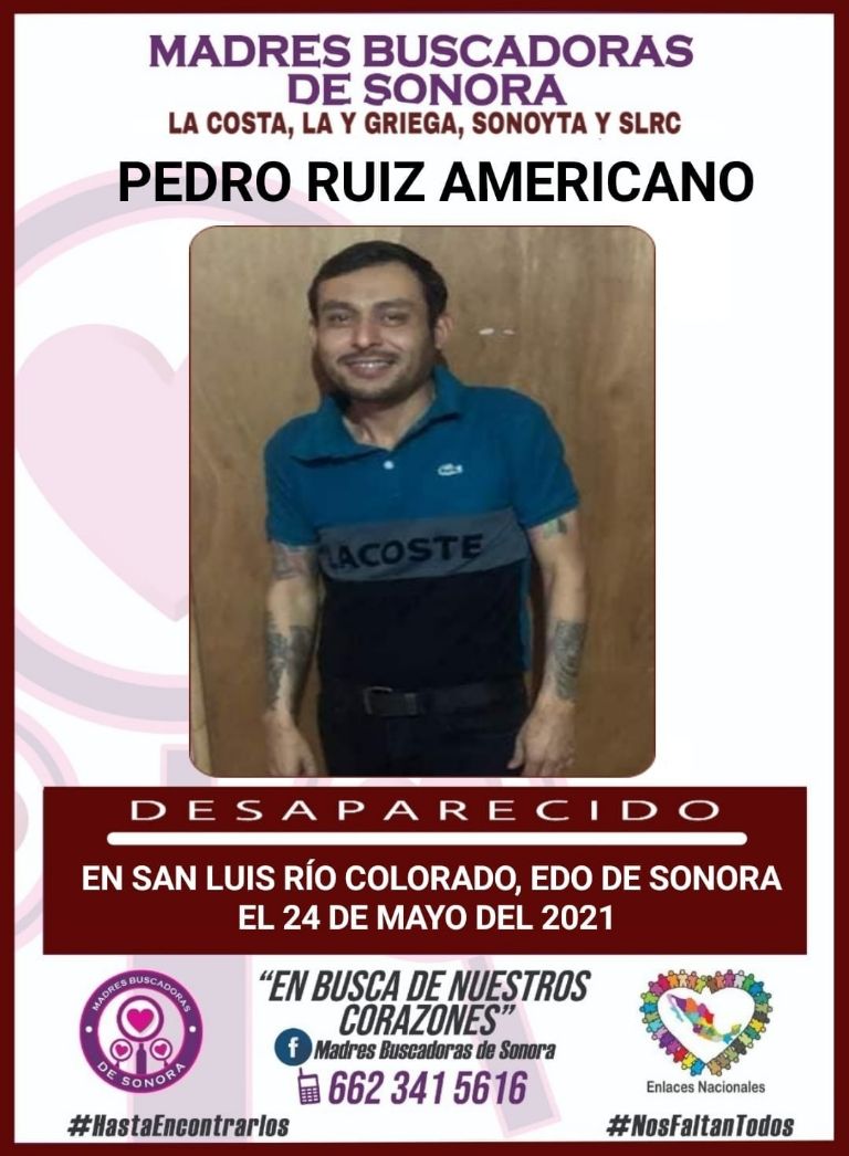 San Luis Río Colorado, Sonora.- El colectivo Madres Buscadoras de Sonora reveló este sábado 29 de mayo que el joven Pedro Ruiz Americano se encuentra en calidad de desaparecido desde hace varios días en San Luis Río Colorado.