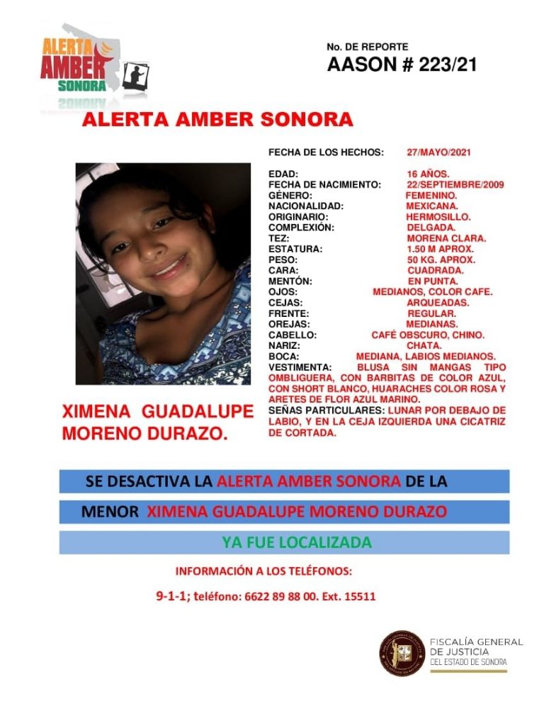 Con esta noticia se desactivó la Alerta Amber Sonora que había sido puesta en circulación este sábado 29 mayo cuando sus familiares acudieron ante la Fiscalía General de Justicia del Estado para levantar una denuncia por su extravío.