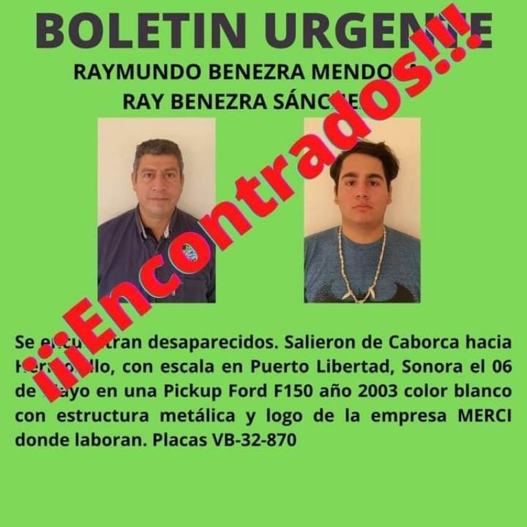 Se trata del señor Raymundo Benezra Mendoza y el joven Raymundo Benezra Sánchez, quienes fueron localizados sobre la brecha que conduce de Puerto Lobos a Puerto Libertad, después de que el vehículo en el que viajaban quedara varado.