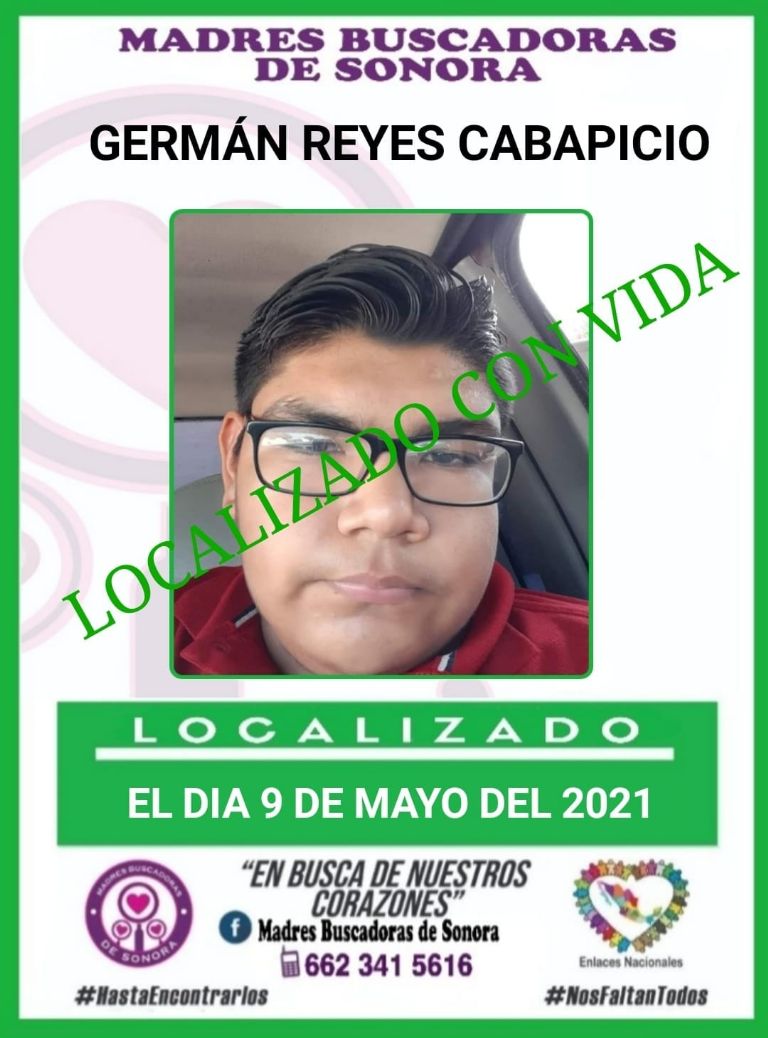 Ciudad Obregón, Sonora.- El colectivo Madres Buscadoras de Sonora informó a través de redes sociales que un menor de edad, Germán Reyes Cabapicio, reportado como desaparecido en Cajeme fue localizado sano y salvo este domingo 6 de mayo.