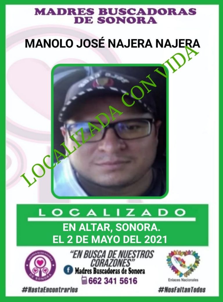 Altar, Sonora.- La noche de este domingo, se confirmó que Manolo José Nájera Nájera, hombre de la cual se desconocía de su paradero desde hace varios días, fue localizado sano y salvo este mismo día en Altar, Sonora.