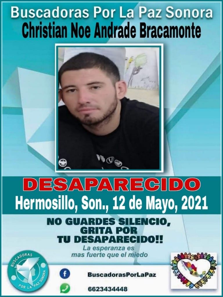 Así lo reveló la agrupación Buscadoras por la Paz, quien a través de Facebook compartió la ficha de búsqueda de Christian Noé e indicó que la última vez que sus parientes supieron algo de él fue el pasado 12 mayo.