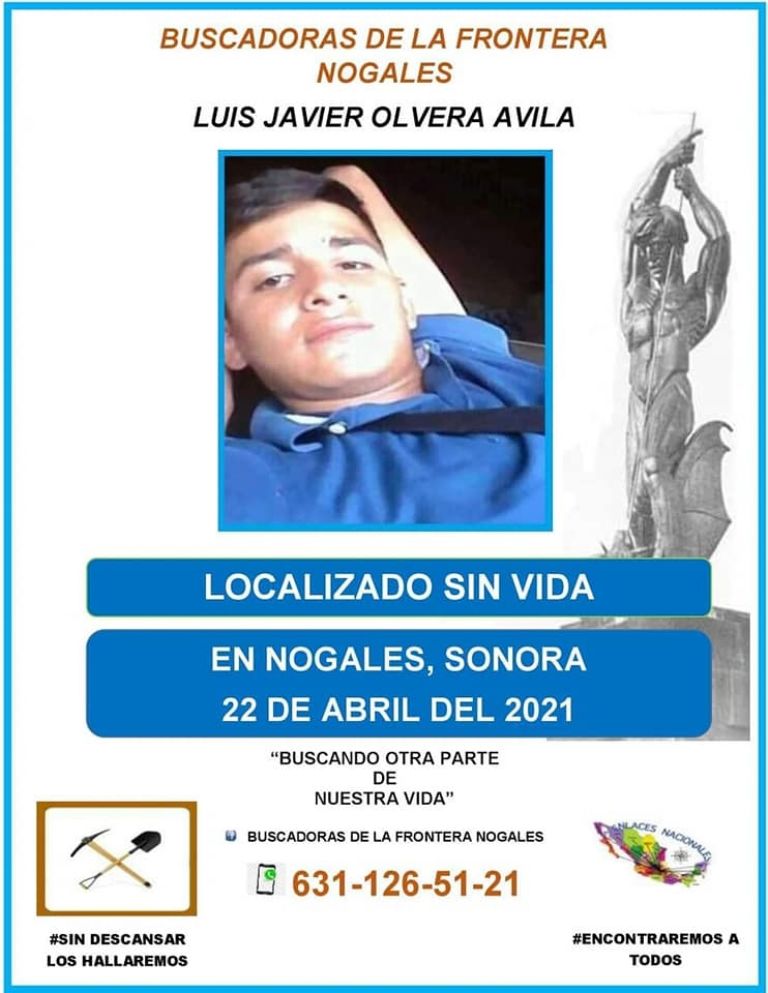 Nogales, Sonora.- El colectivo Buscadoras de la Frontera Nogales informó que el cuerpo sin vida del joven Luis Javier Olvera Ávila fue encontrado tras casi un año en el que permaneció en calidad de desaparecido en su natal Nogales.