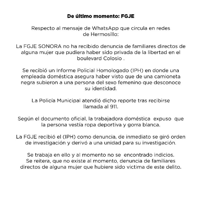 Tras estarse compartiendo el mensaje por WhatsApp, la Fiscalía General de Justicia del Estado de Sonora (FGJE) aclaró mediante de un comunicado que no han recibido ninguna denuncia sobre alguna mujer que pudiera haber sido privada de la libertad en el bulevar Colosio.