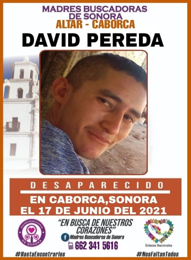 Caborca, Sonora.- El pasado viernes 18 de junio, el colectivo Madres Buscadoras de Sonora reveló que el joven David Pereda se encuentra en calidad de desaparecido desde hace varios días en la ciudad de Caborca, Sonora.